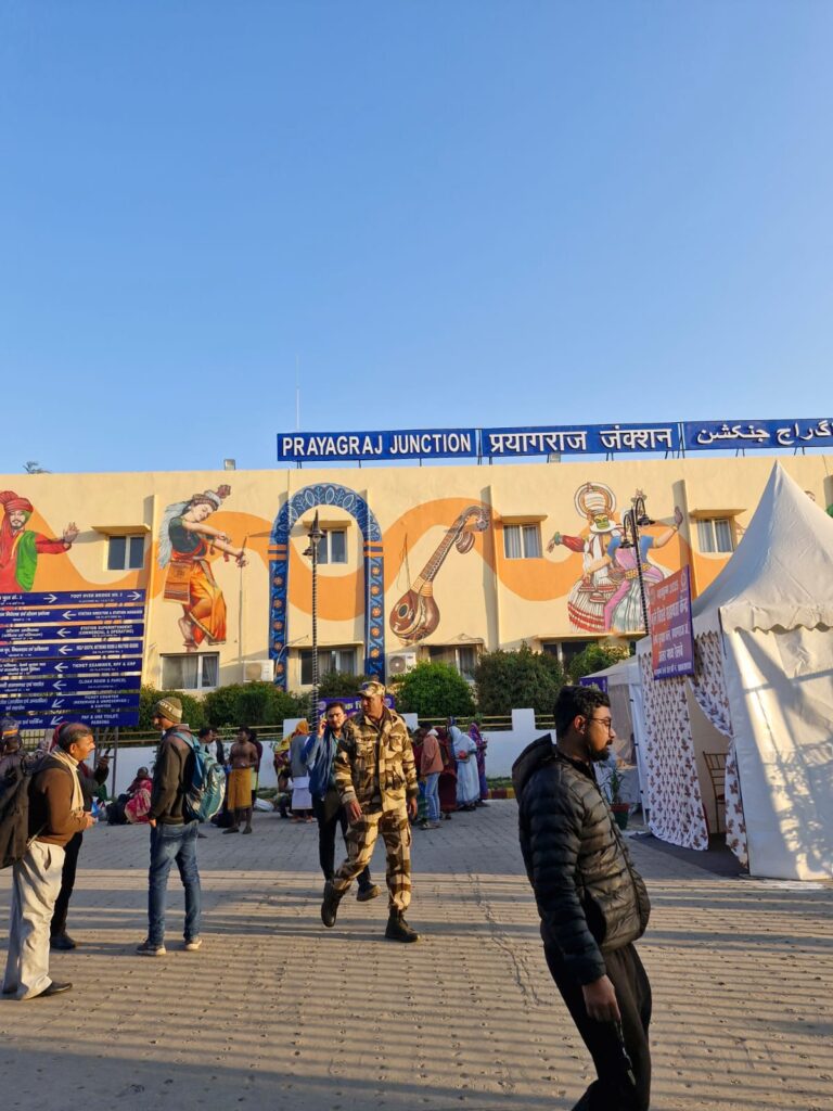 Qué hice apenas llegué: La estación de Prayagraj era un escenario saturado. El caos visual y auditivo hacía difícil orientarse. Desde la ventana del tren ya podía ver miles de carpas improvisadas extendiéndose hasta donde alcanzaba la vista, instaladas para dar refugio a los millones de peregrinos. Era impactante observar tanto movimiento humano en un solo punto: familias enteras, ascetas, turistas, vendedores, policías y voluntarios, todos convergiendo hacia el mismo objetivo espiritual. Decidí aprovechar las primeras horas del día para recorrer algunos lugares importantes de Prayagraj antes de dirigirme al evento principal. Entre ellos: