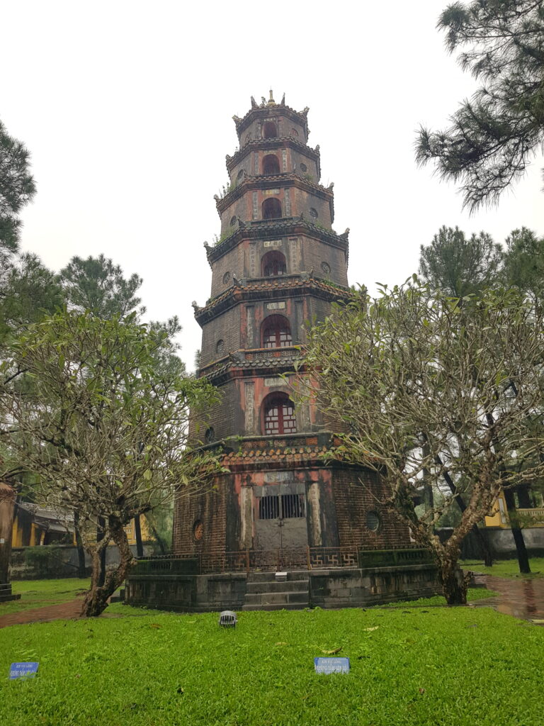 - 5) Pagoda Thien Mu: Es uno de los templos más representativos de Hue y un importante símbolo espiritual de la ciudad. Ubicada a orillas del río Perfume, ofrece un ambiente tranquilo y vistas muy bonitas del entorno. Se puede llegar fácilmente en taxi, bicicleta o incluso en barco. La entrada es gratuita y el complejo cuenta con varios patios, jardines y una torre octogonal que es el principal atractivo del lugar. Abre de 08:00a.m hasta las 17:00p.m, la entrada es gratuita. Es una visita ideal para desconectar y conocer el lado más espiritual de Hue.