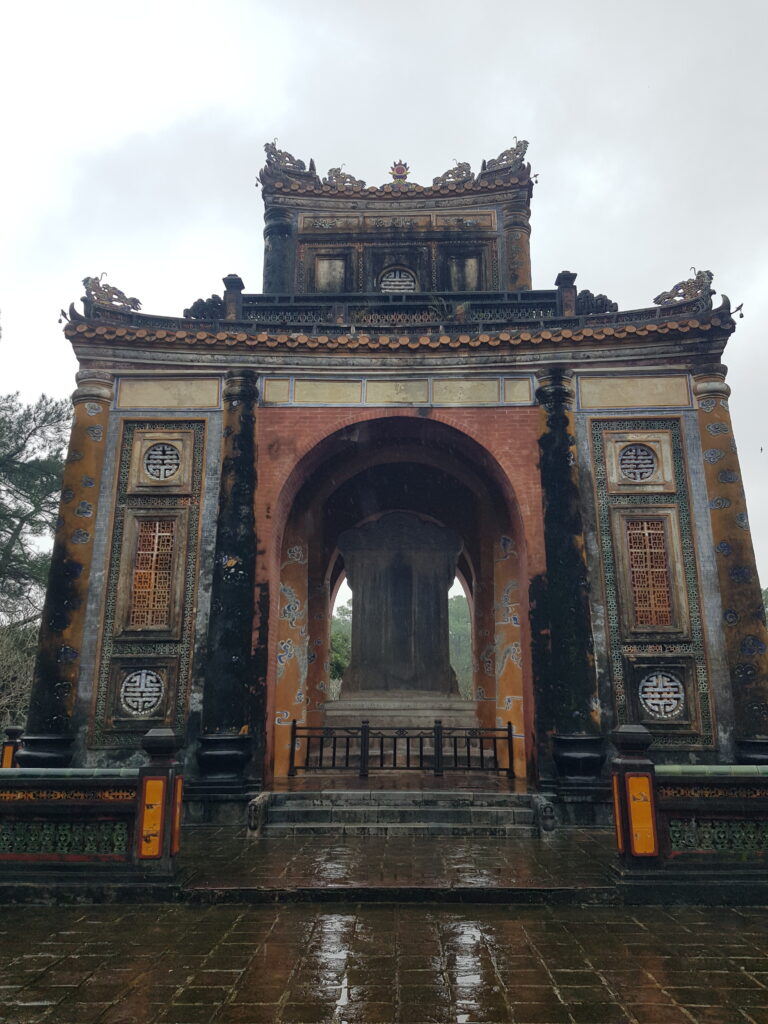 - 2) Tumba del emperador Khai Dinh: Es una de las más llamativas y fotografiadas de Hue, y representa muy bien el estilo único de las tumbas imperiales de la ciudad. Su arquitectura combina elementos occidentales y orientales, algo poco común en Vietnam, lo que la convierte en una visita muy especial. Construida a principios del siglo XX, destaca por su gran escalinata, estatuas de piedra y una decoración interior llena de mosaicos y detalles ornamentales. En el interior se encuentra la tumba del emperador, rodeada de una decoración impresionante que refleja la grandeza de la última etapa imperial de Hue. La tumba se ubica a unos 10 km del centro y es fácil llegar en taxi o moto.