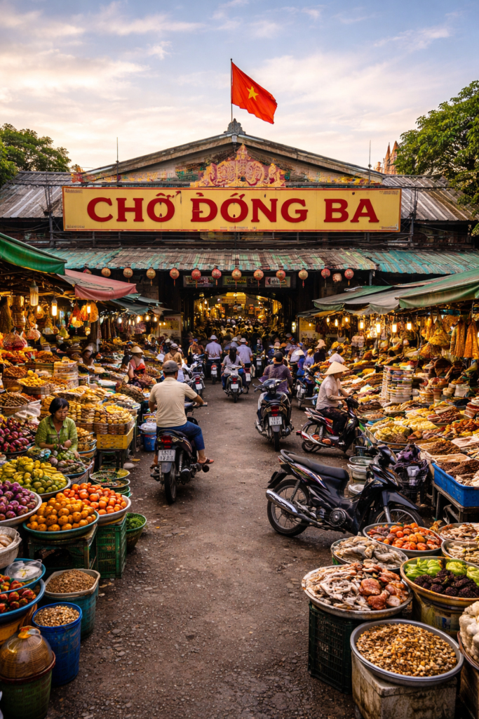 - 10) Compras en el mercado Dong Ba: Este es uno de los lugares mas importantes para conocer mas de la vida cotidiana de las personas vietnamitas de Hue. ideal para quienes desean conocer de cerca las tradiciones y costumbres vietnamitas. Aquí encontrarás una gran variedad de productos, desde comida local y especias hasta ropa, artesanías y souvenirs típicos de la región. Este lugar está en el corazón de Hue, por lo que es fácil llegar desde cualquier punto que estes en la ciudad. Si tienes curiosidad de visitarlo, abre de 6:00 a 18:00 de la noche, esta es una experiencia única que cualquier viajero debe visitar en Hue.