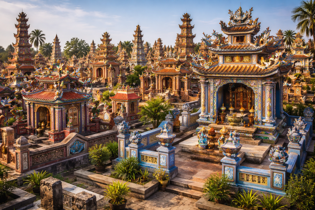 - 11) Excursión al cementerio An Bang: Se encuentra a unos 35KM del centro de Hue, es uno de los lugares más sorprendentes de la región. Aquí se pueden ver tumbas de muchos colores y tamaños, decoradas de forma muy llamativa y única. Si tienes tiempo suficiente y te gusta descubrir lugares diferentes, esta excursión vale la pena para conocer una parte menos conocida pero muy representativa de la vida y cultura de Hue.
